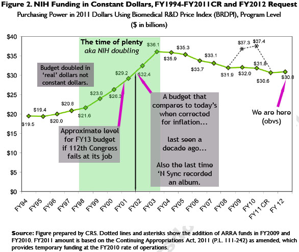 Meanwhile, the purchasing power of the research grant dollar has declined, yet the modular budget cap (currently $250,000) hasn’t changed. Since the end of the NIH budget doubling, budget appropriations for NIH haven’t even kept pace with inflation. Just how far behind inflation is the NIH budget? I clipped the graph below from a Congressional Research Service report [PDF download], which shows previous budgets in terms of 2012 dollars. I made a few annotations to illustrate my point. The graph includes the FY2012 budget request; the final budget settled at $30.6B. If we track back, we find a comparable budget in … 2002. That’s right – a decade ago, in the latter half of the NIH doubling phase.